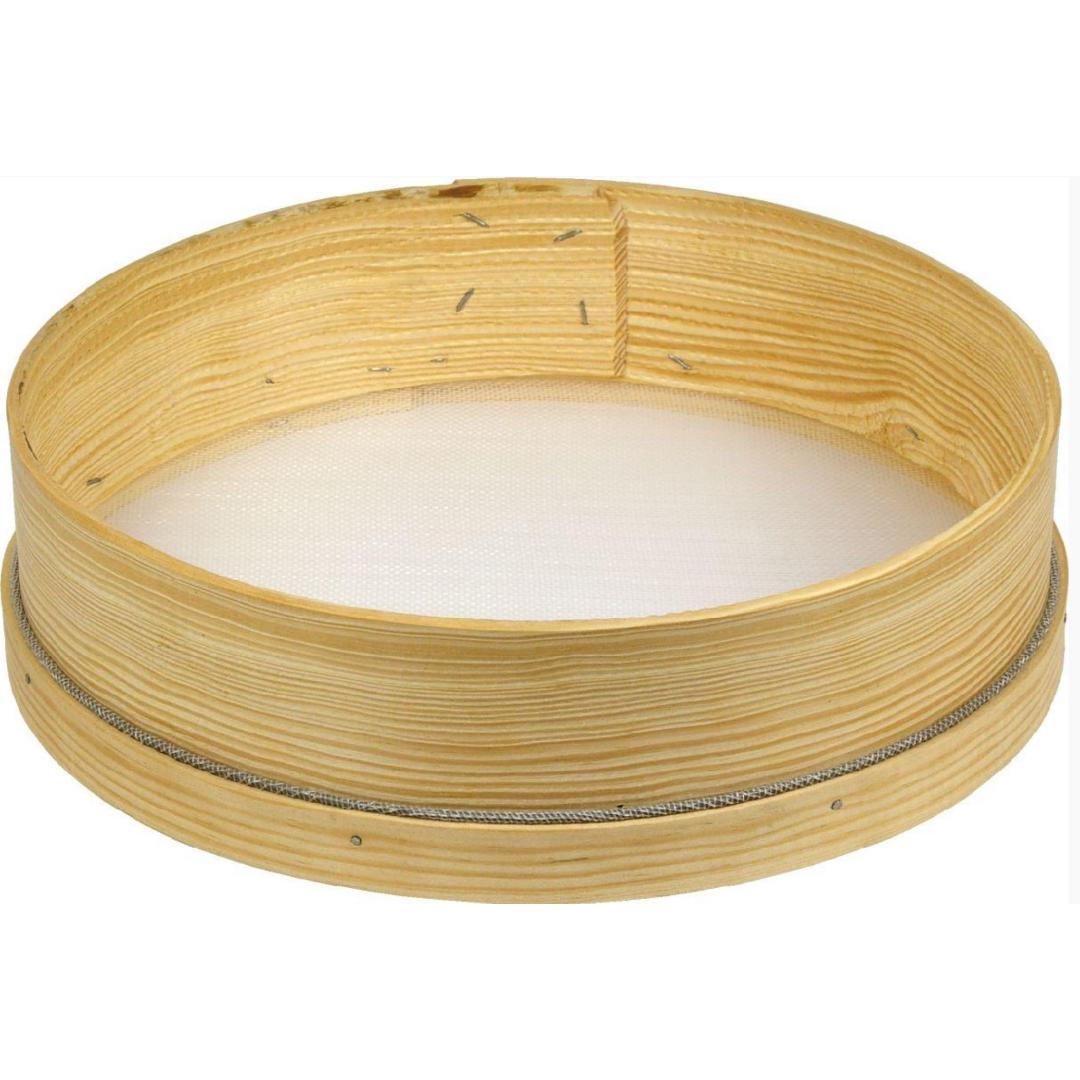 Criba tradicional de 24 cm de diámetro con fondo de seda natural, pensada para trabajos de selección y tamizado más fino.