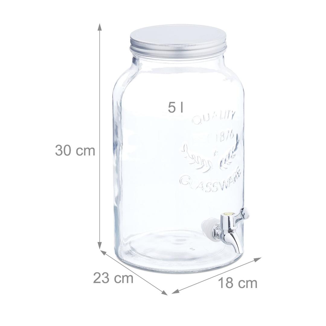 El Dispensador de bebidas de vidrio con grifo 5,5 litros es ideal para servir agua, limonada, zumos o bebidas frías de forma cómoda y práctica en reuniones y celebraciones.