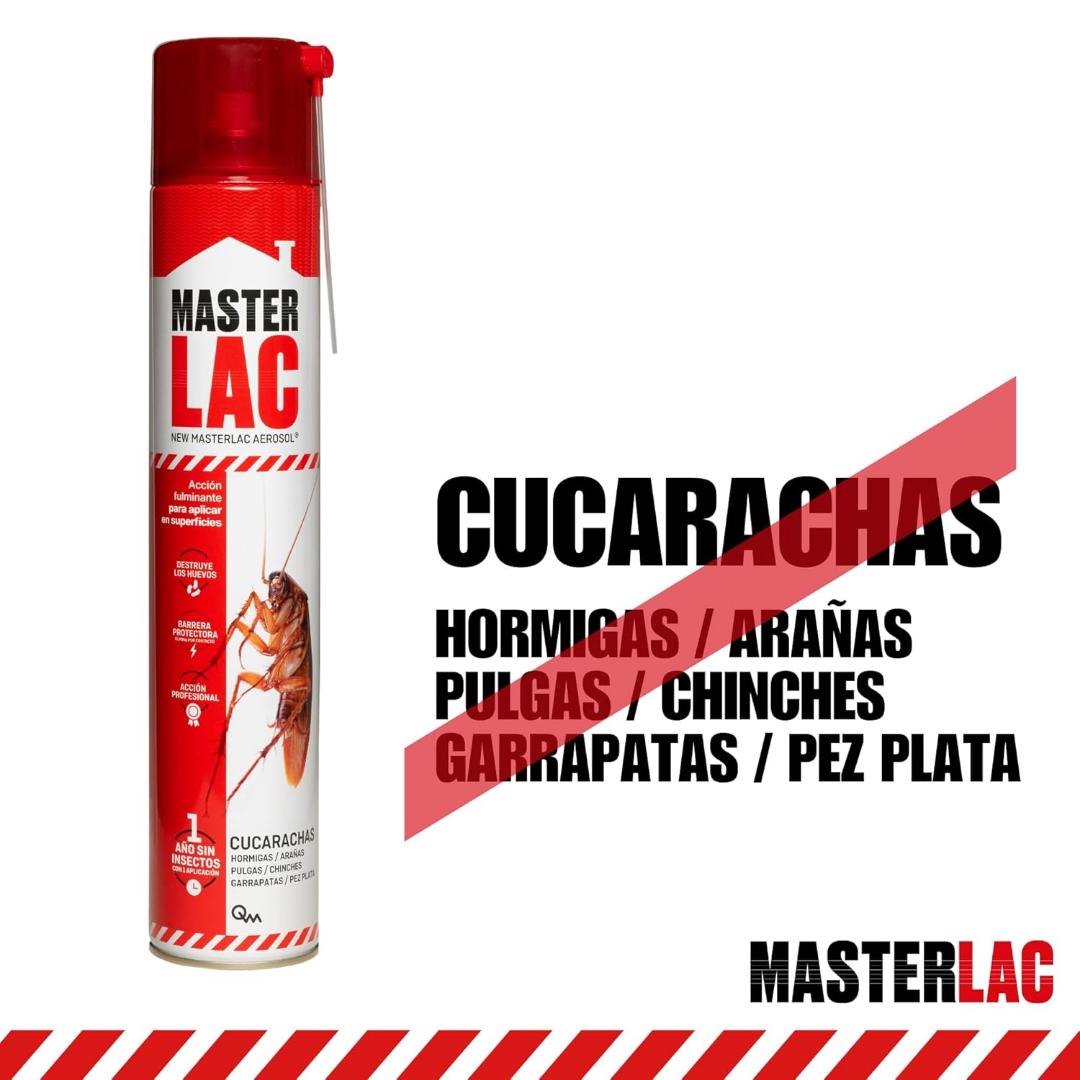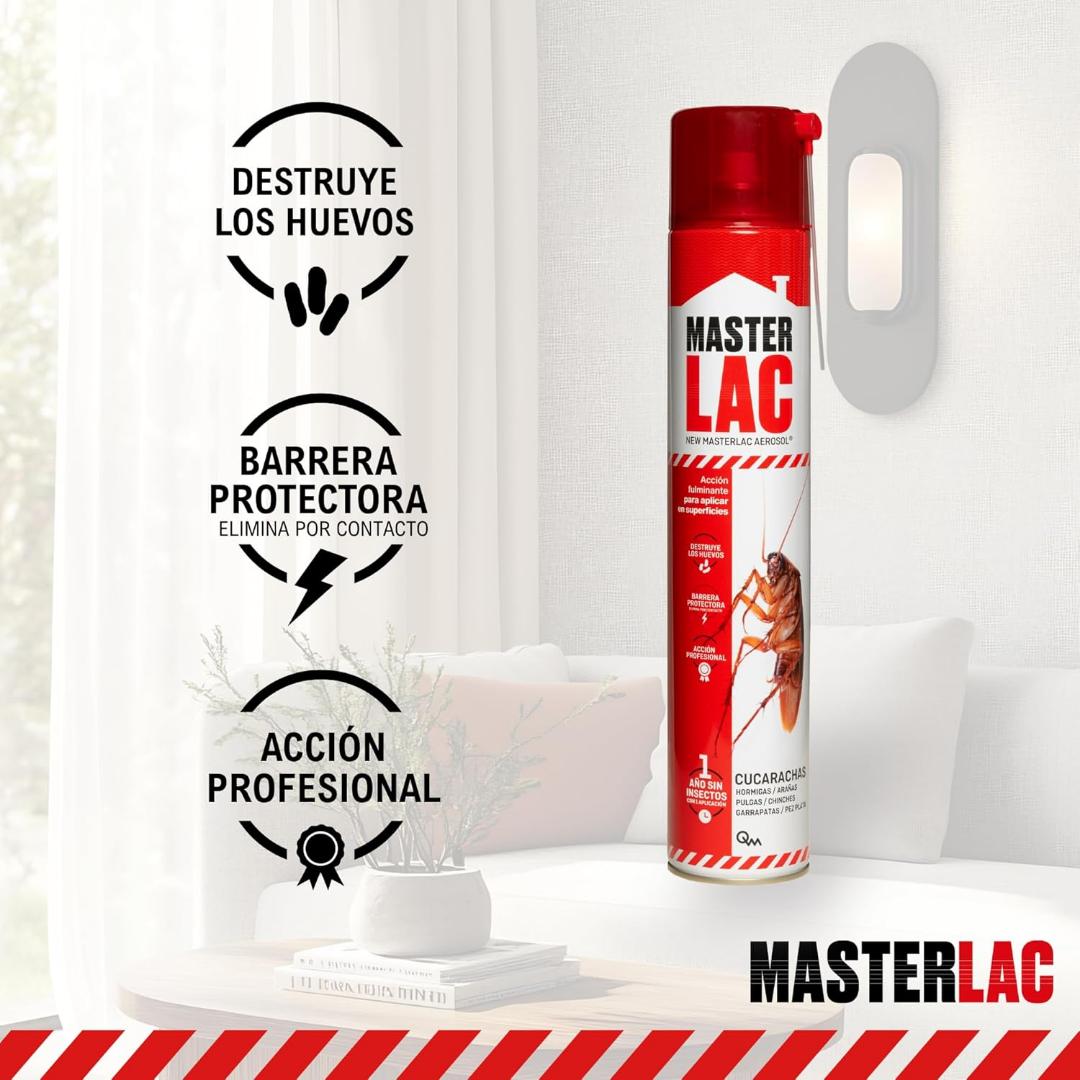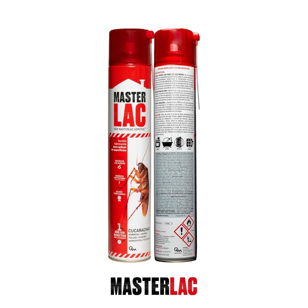 Contra todo tipo de insectos rastreros (cucarachas, hormigas, arañas, pez de plata, pulgas, chinches). Está formulado con propiedades profesionales en forma de laca para uso en el hogar. MASTERLAC crea una barrera protectora invisible y elimina los insectos por contacto. El efecto es instantáneo, y su eficacia de larga duración. Eficacia extraordinaria, tiene también acción larvicida, elimina las larvas de los insectos evitando así nuevas infestaciones.
