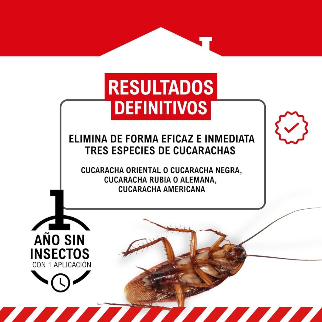 Elimina eficazmente las tres especies de cucarachas (cucaracha oriental o cucaracha negra, cucaracha rubia o alemana, cucaracha americana).