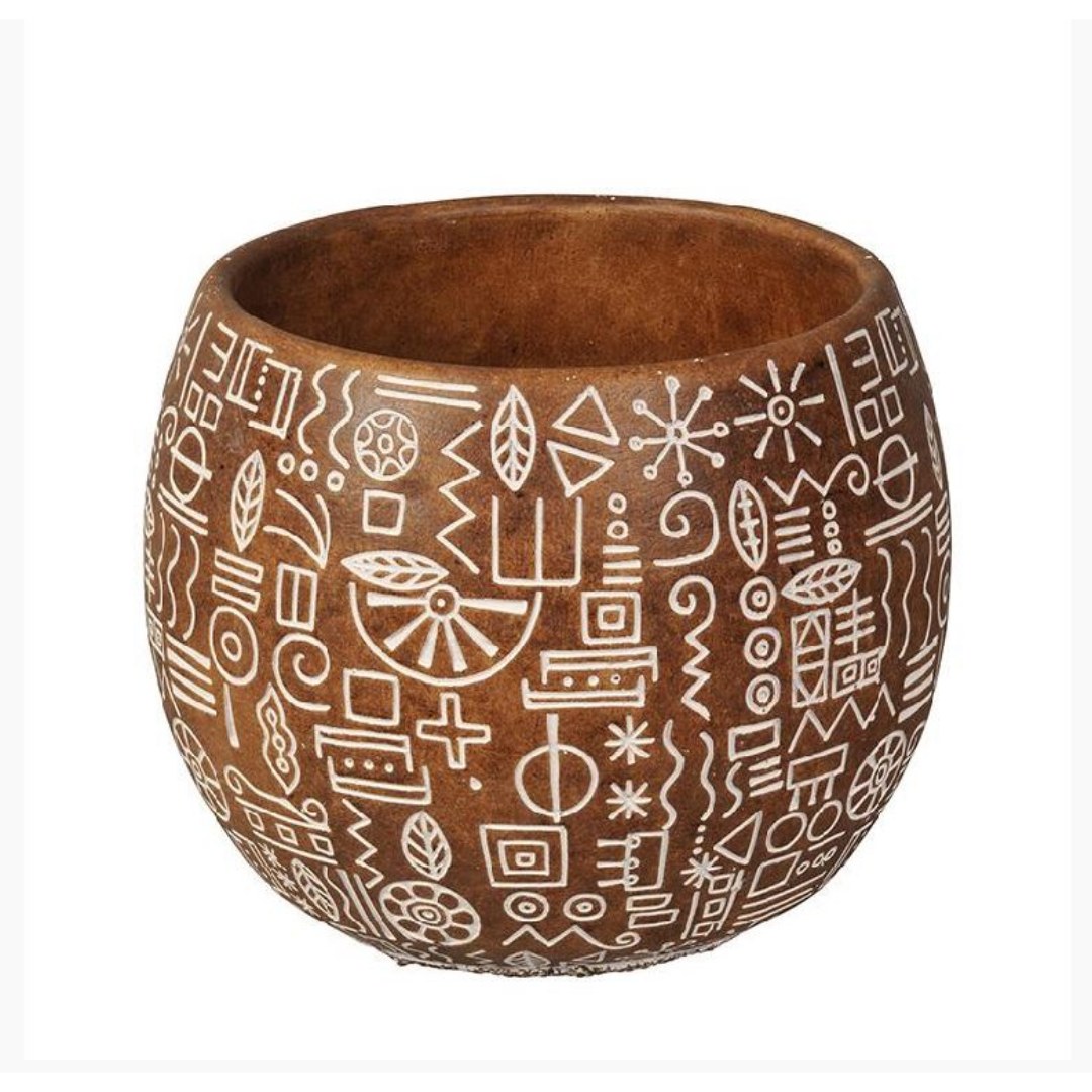 Maceta decorativa con motivos étnicos,fabricada en terracota, con un acabado artesanal y una textura natural que aporta calidez y personalidad a cualquier espacio.