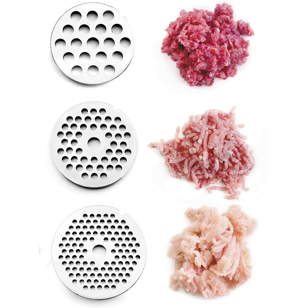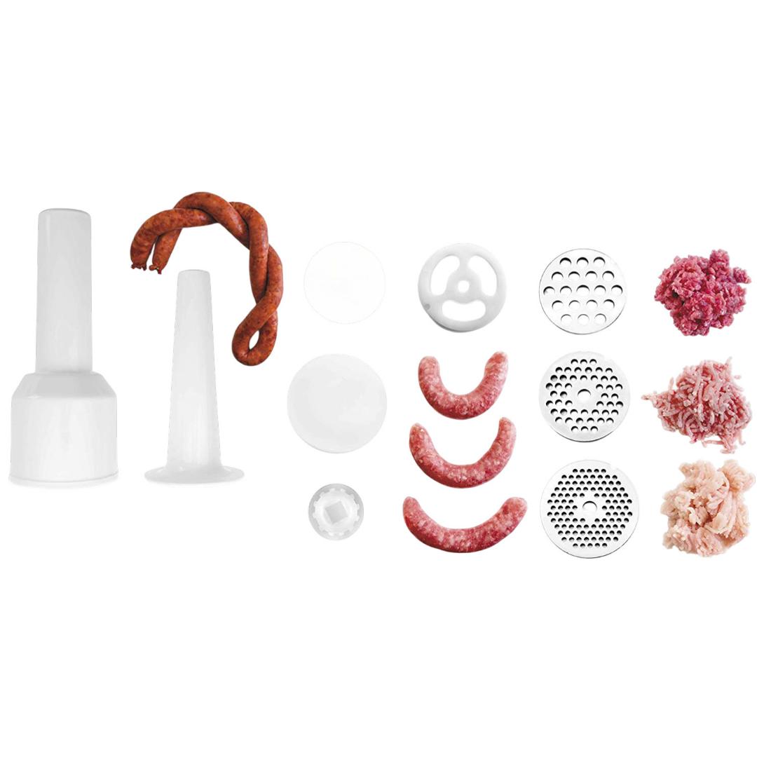 • Incluyen 3 discos perforados de acero inoxidable y accesorios para preparar embutido (Kibbe incluido).