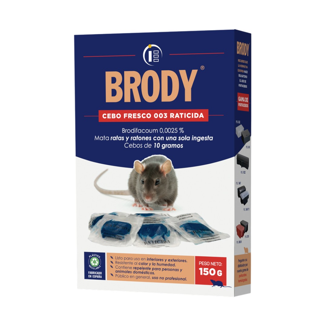 Raticida en forma de cebo fresco de gran apetencia formulado con harinas y aceites vegetales indicado para la eliminación de ratas y ratones con una sola ingestión. Cebos de 10 g. Contiene repelente.