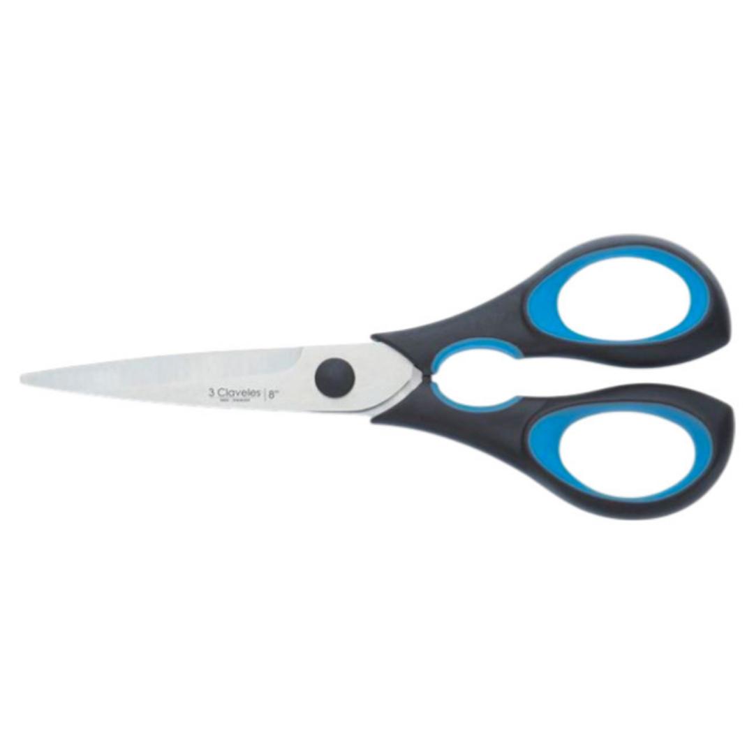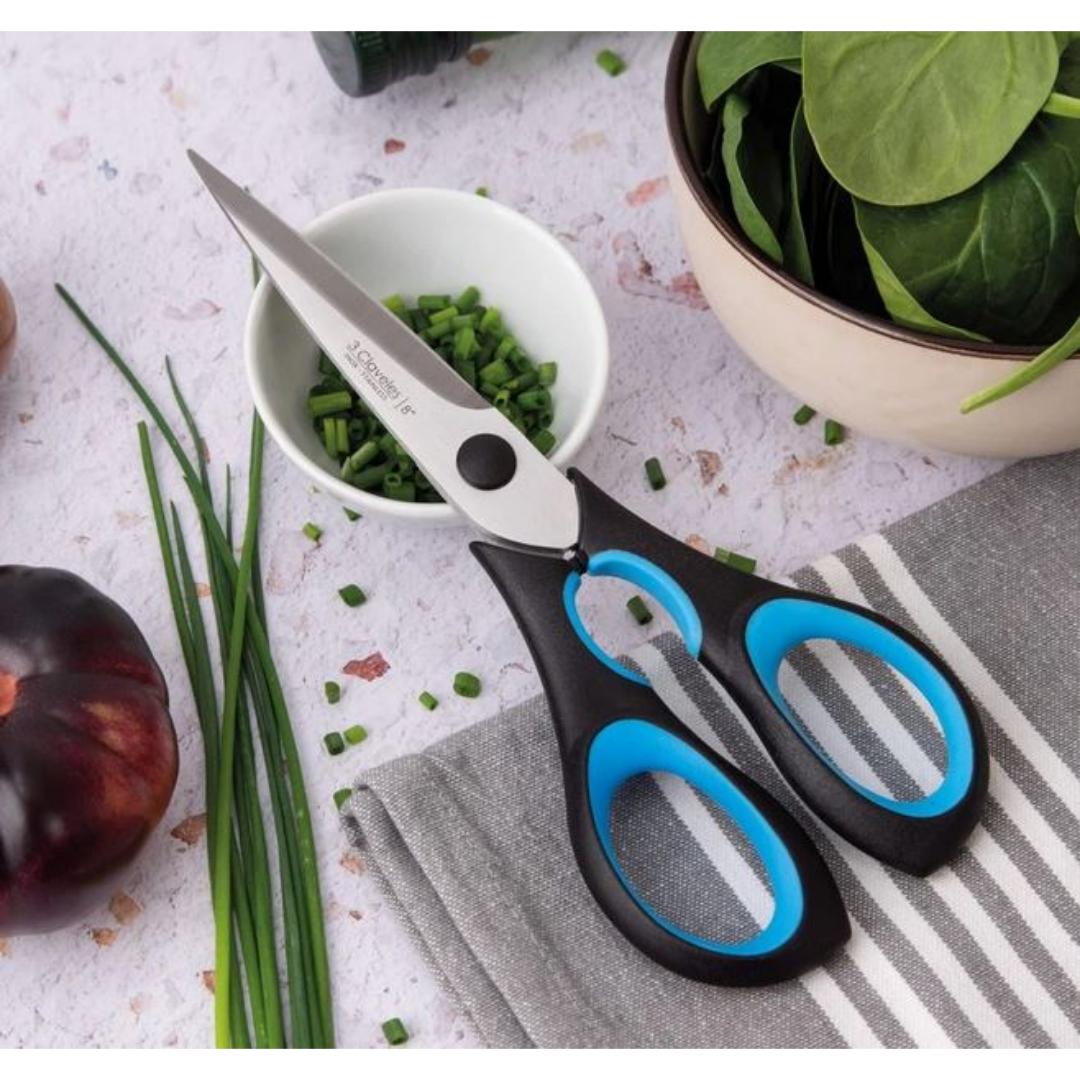 Tijera de cocina Ergo en acero inoxidable resistente y muy ligera, con mango ergonómico soft grip que facilita un buen agarre.