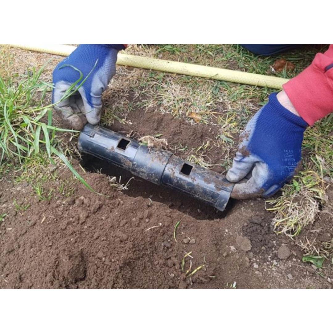Localice el montón de tierra más reciente y abra la galería con una pala en un ancho de 25 cm, despeje las aberturas y coloque la trampa en posición horizontal con la ranura hacia arriba. Cubra la trampa con tierra, ladrillos, piedras